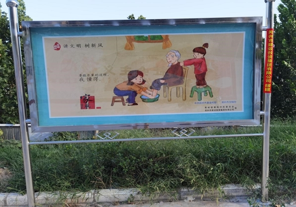 四、设置宣传载体,营造文明家园浓郁氛围。今年,集团公司为郭岗村提供3万余元帮扶资金帮助其打造了精神文明专栏,分为家风家训(名人家风)专栏,“讲文明 树新风”(孝当先、传承家风)、“文明健康 有你有我”公益广告等内容,使社会主义核心价值观深刻融入到村民的生产生活和精神世界,形成全体村民的修身行善共识和明礼守法自觉,为促进郭岗村经济健康发展、构建美丽乡村、文明家园打下良好根基。