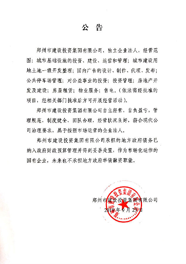 郑州市建设投资集团有限公司不承担地方政府举债融资职能的公告